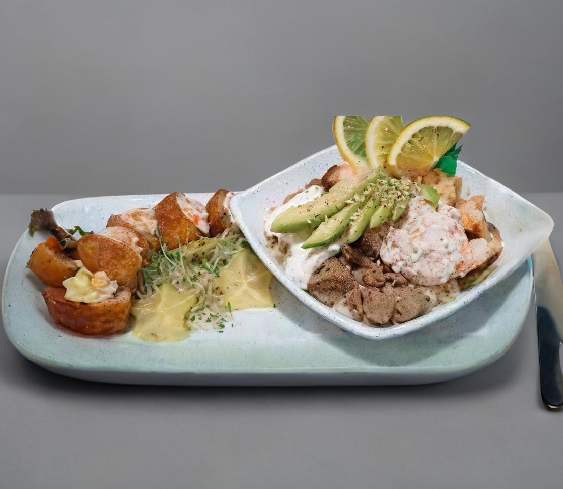 Deliciosa combinación de camarones empanizados, dedos de queso, trocitos de pollo frito acompañados con aderezo de la casa.