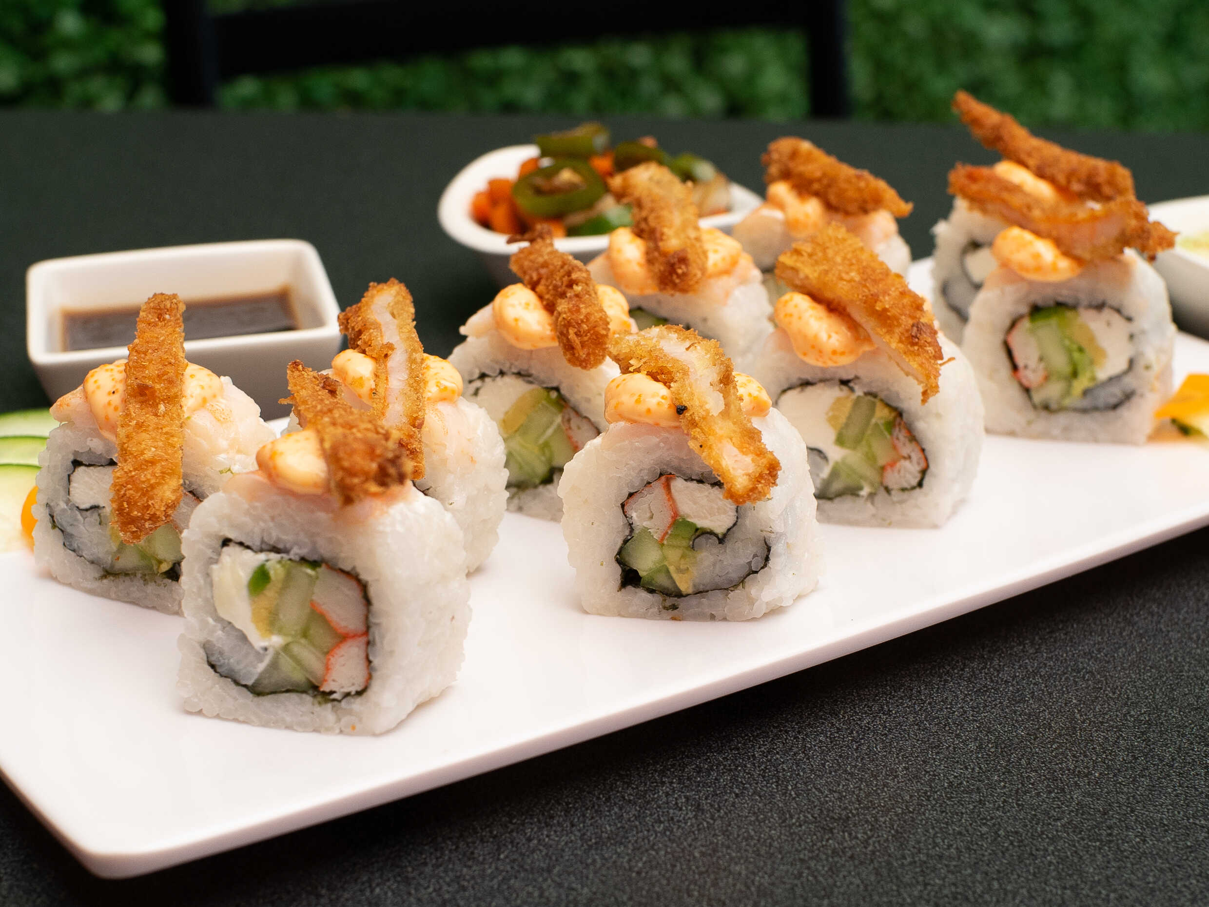 Camarón, masago, aguacate, queso crema y pepino por dentro, capeado todo el rollo en pasta tempura y bañado con salsa de ...