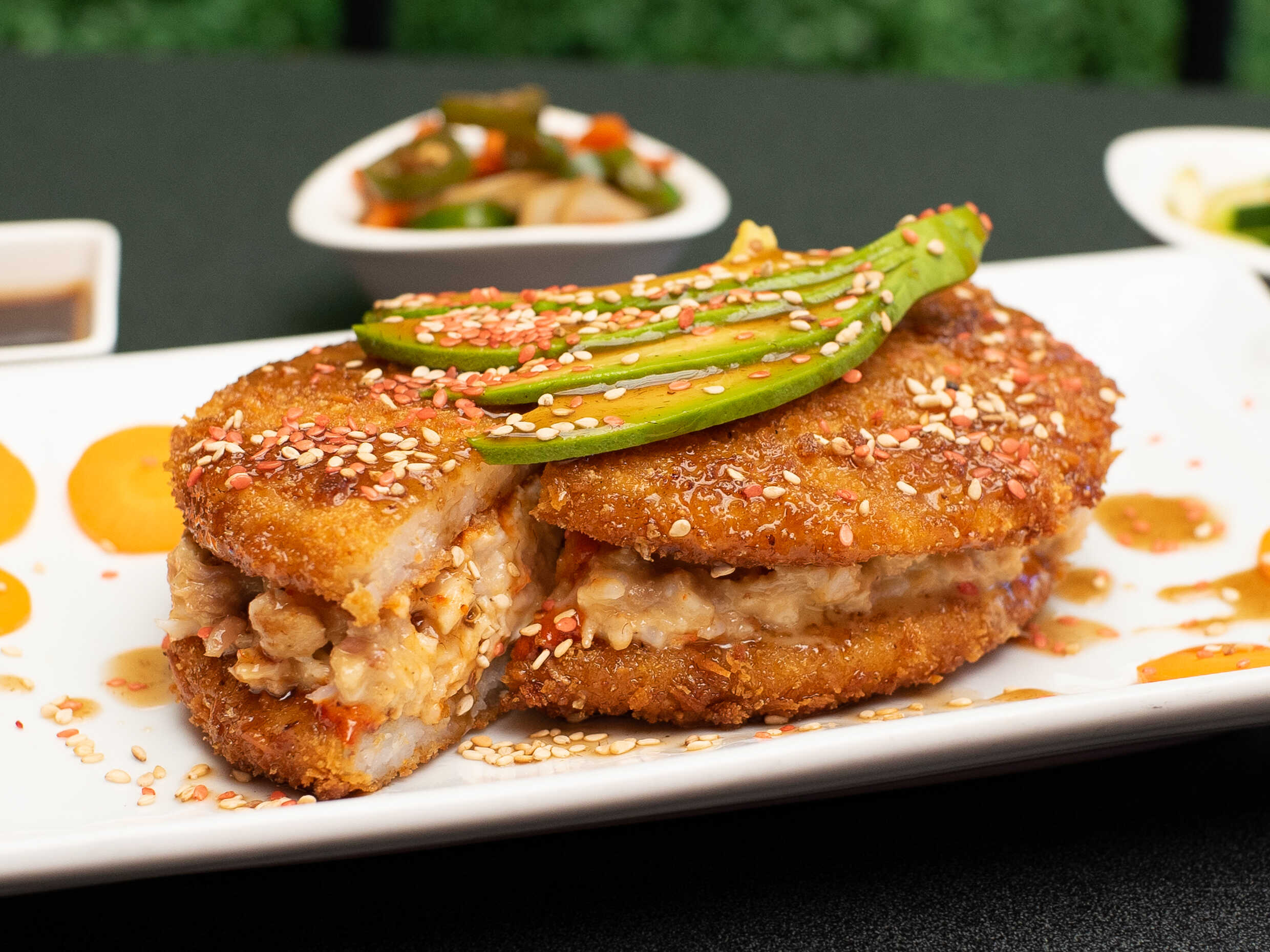 Relleno de cangrejo empanizado, aguacate, Philadelphia y chile chipotle envuelto en queso manchego con furikake, tampico y aderezo de chipotle por fuera.