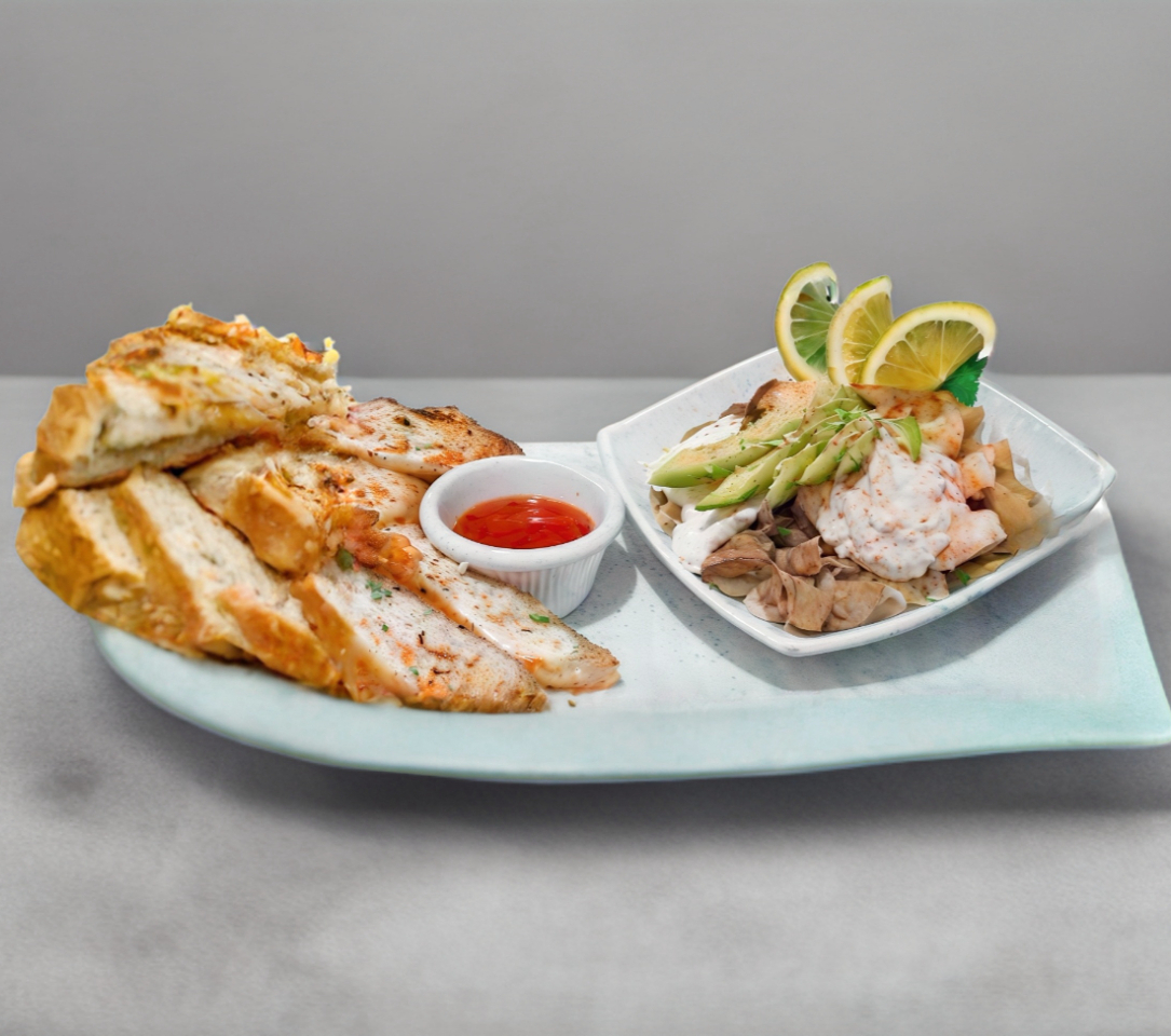Barra de surimi rellena de queso crema, manchego, camarón y aguacate.