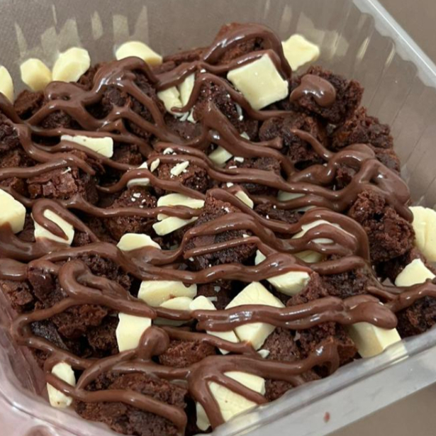 80g de brownie troceado, con topping de trozos de chocolate blanco