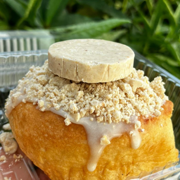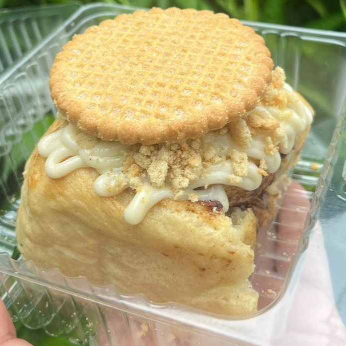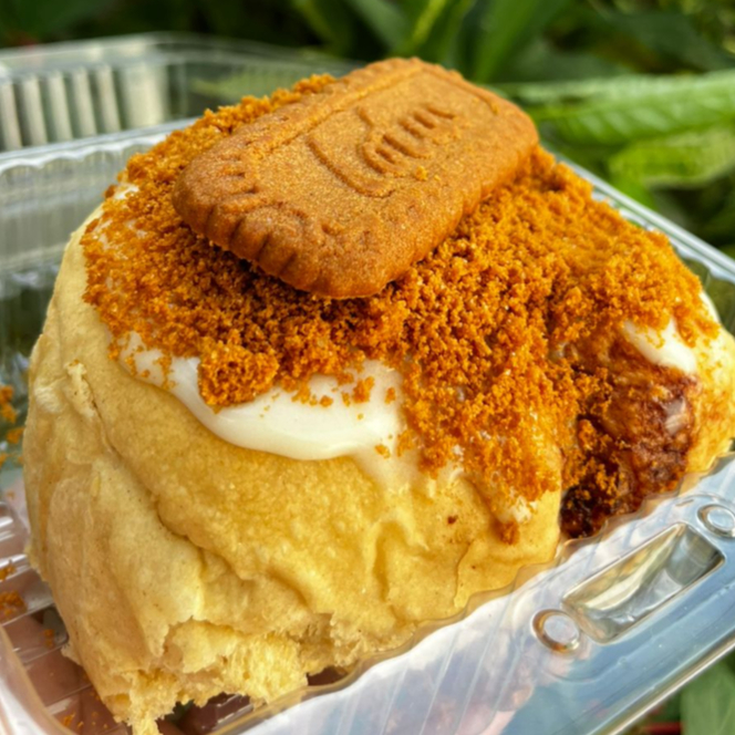 Rol relleno de mantequilla con azúcar mascabada, con topping de galleta Lotus