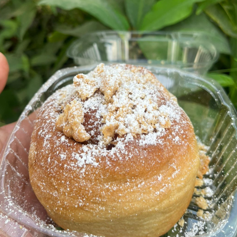 Rol relleno de mantequilla con azúcar mascabada, con el clásico glaseado de la casa