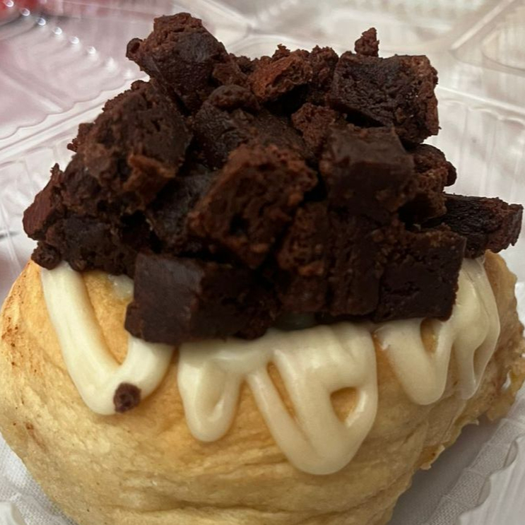 Rol relleno de mantequilla con azúcar mascabada, con topping de brownie troceado