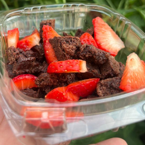 80g de brownie troceado, con topping de fresas
