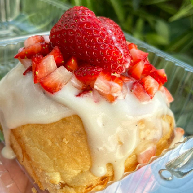 Rol relleno de mantequilla con azúcar mascabada y canela, con topping de fresa