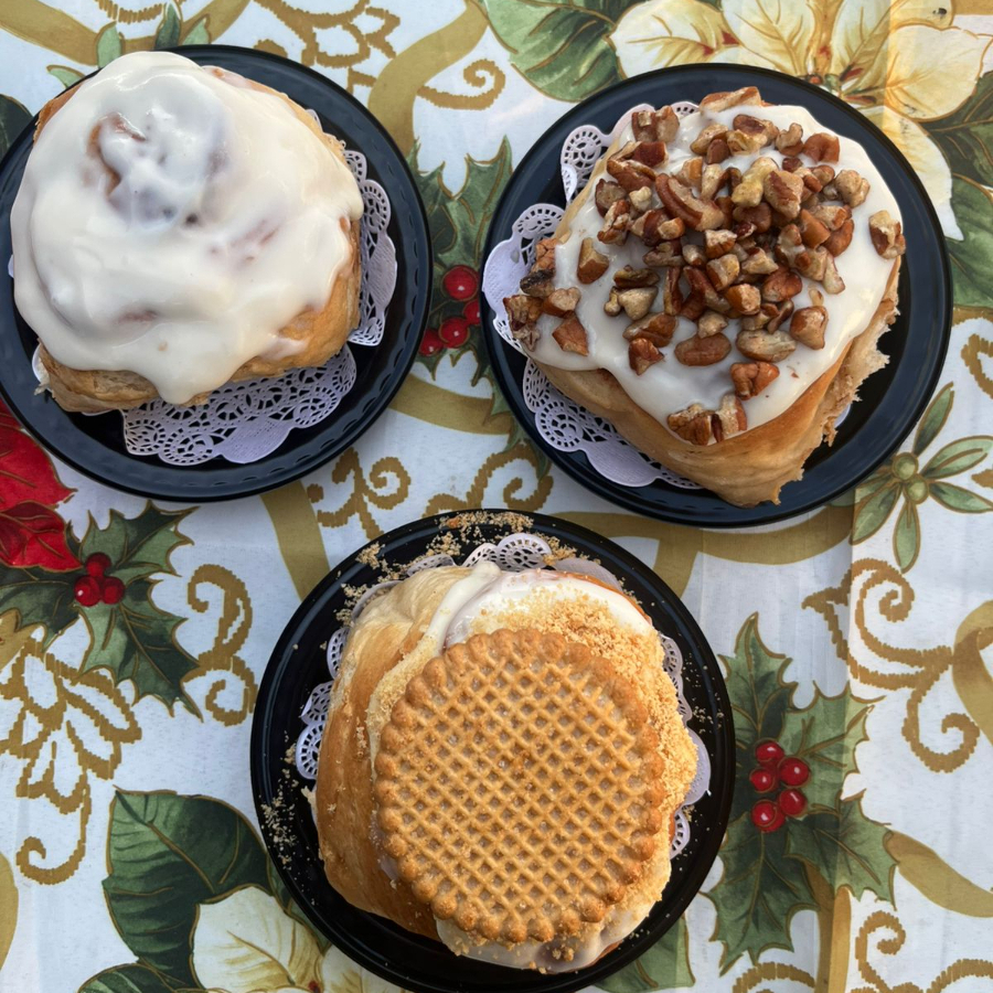 Nuestro tradicional rol de canela con galletas canelitas y un toque de azúcar glass