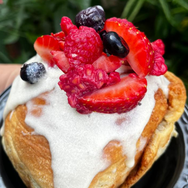 Rol relleno de mantequilla con azúcar mascabada, con topping de frutos rojos