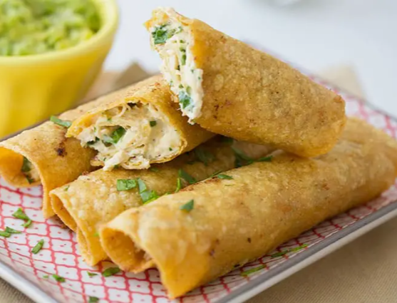 Pieza de taco dorado rellena de pollo.