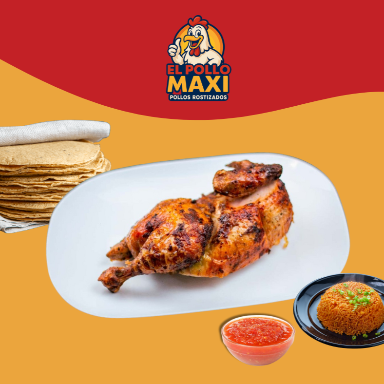 1/2 Jugoso pollo asado, incluye tortillas, arroz y salsa.