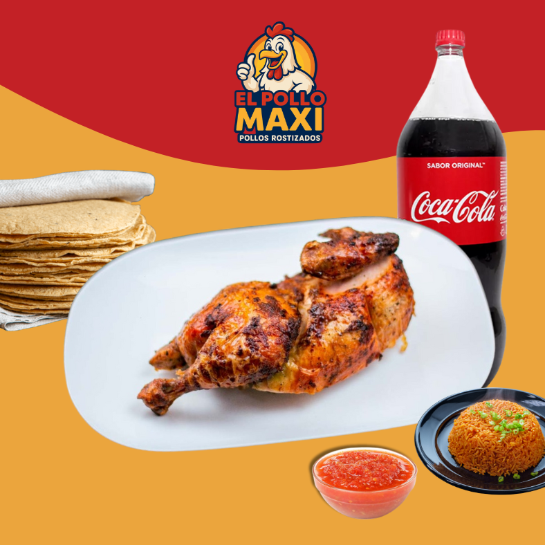 Jugoso pollo asado, incluye tortillas, arroz y salsa Coca Cola 2.5 L.