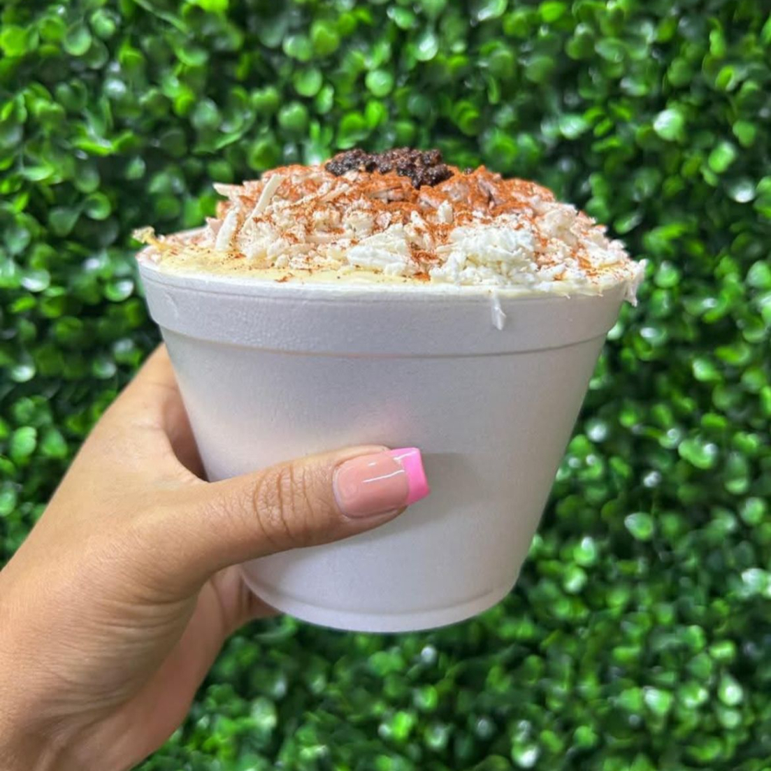 Vaso de 10 Oz de elote acompañado de mayonesa, crema, queso.
