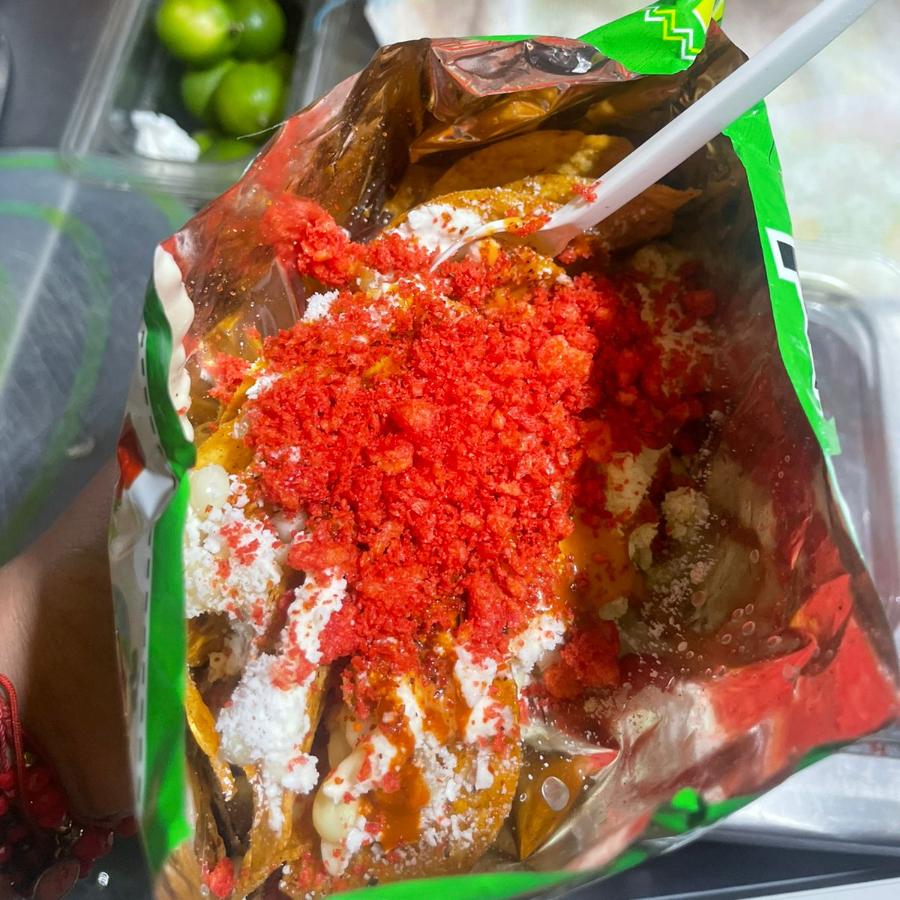 Tostitos con 2 porciones de elote, crema, mayonesa, queso molido y queso de machos. Ingrediente extra $5