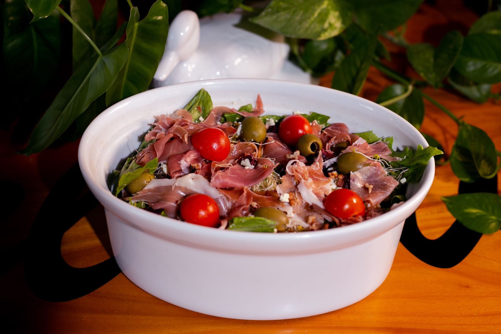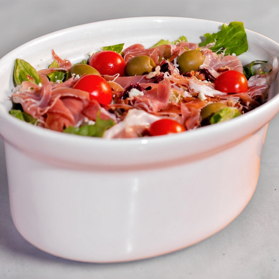 Ensalada base de lechuga con jamón serrano, germinado, jitomate cherry, aceitunas, nuez, arandanos y queso de cabra.