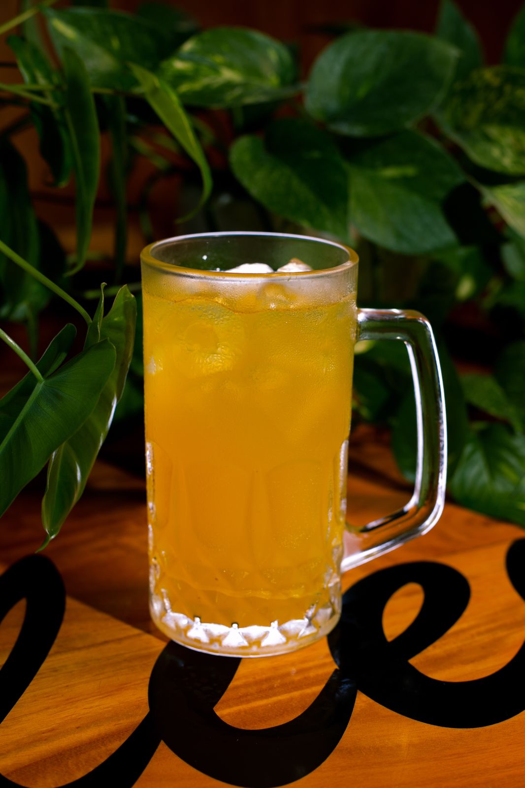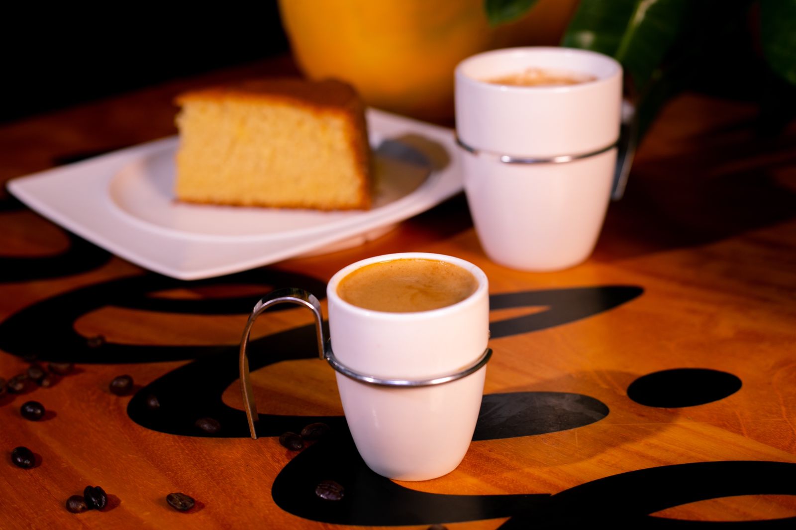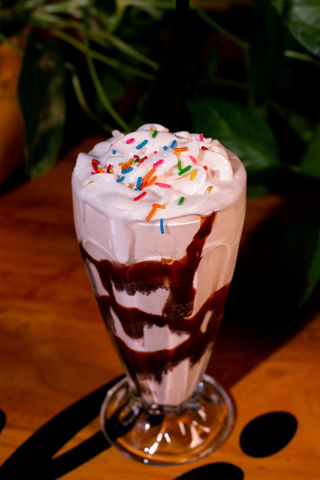 Shot de cafe expresso sobre leche en las rocas y un shot de jarabe de chocolate.
