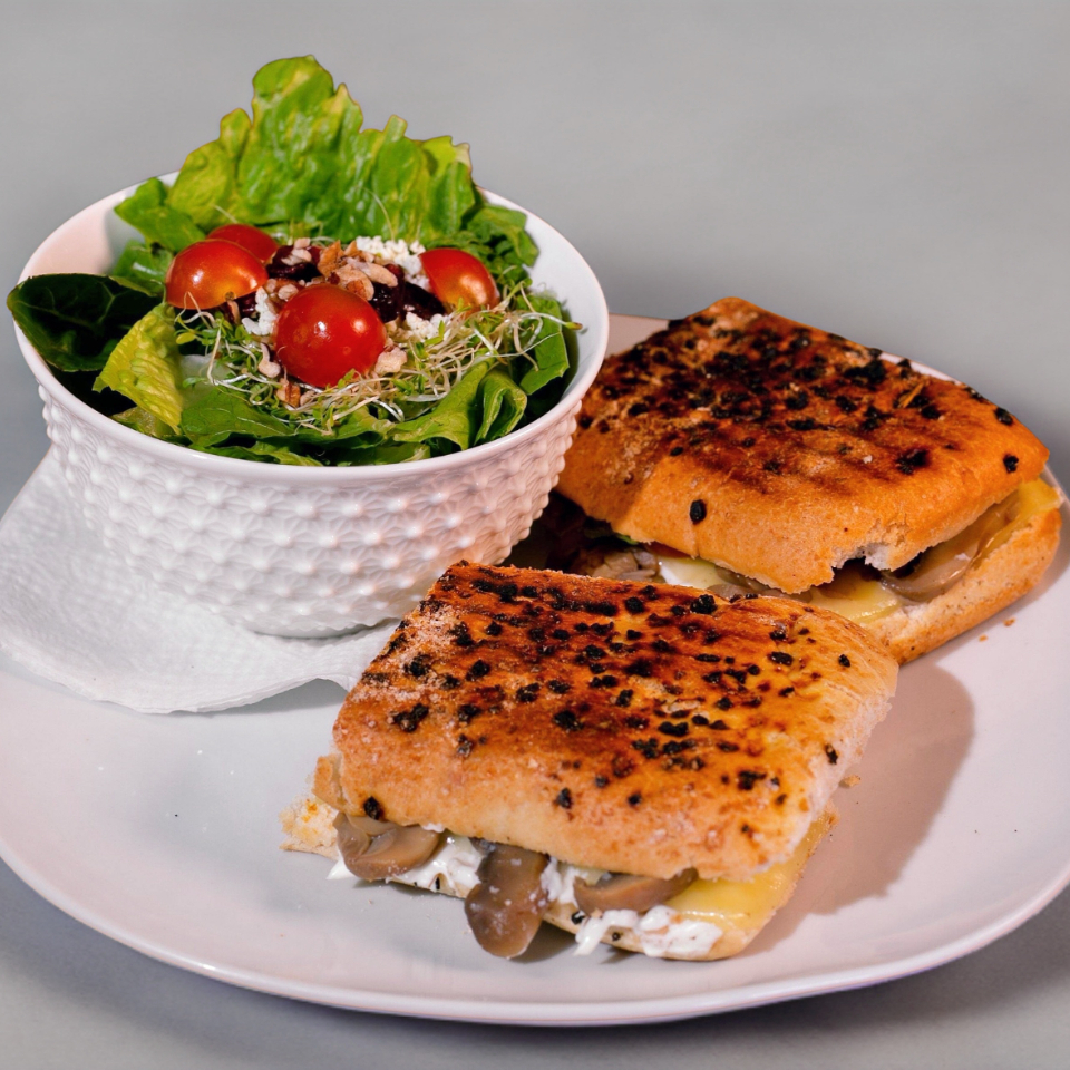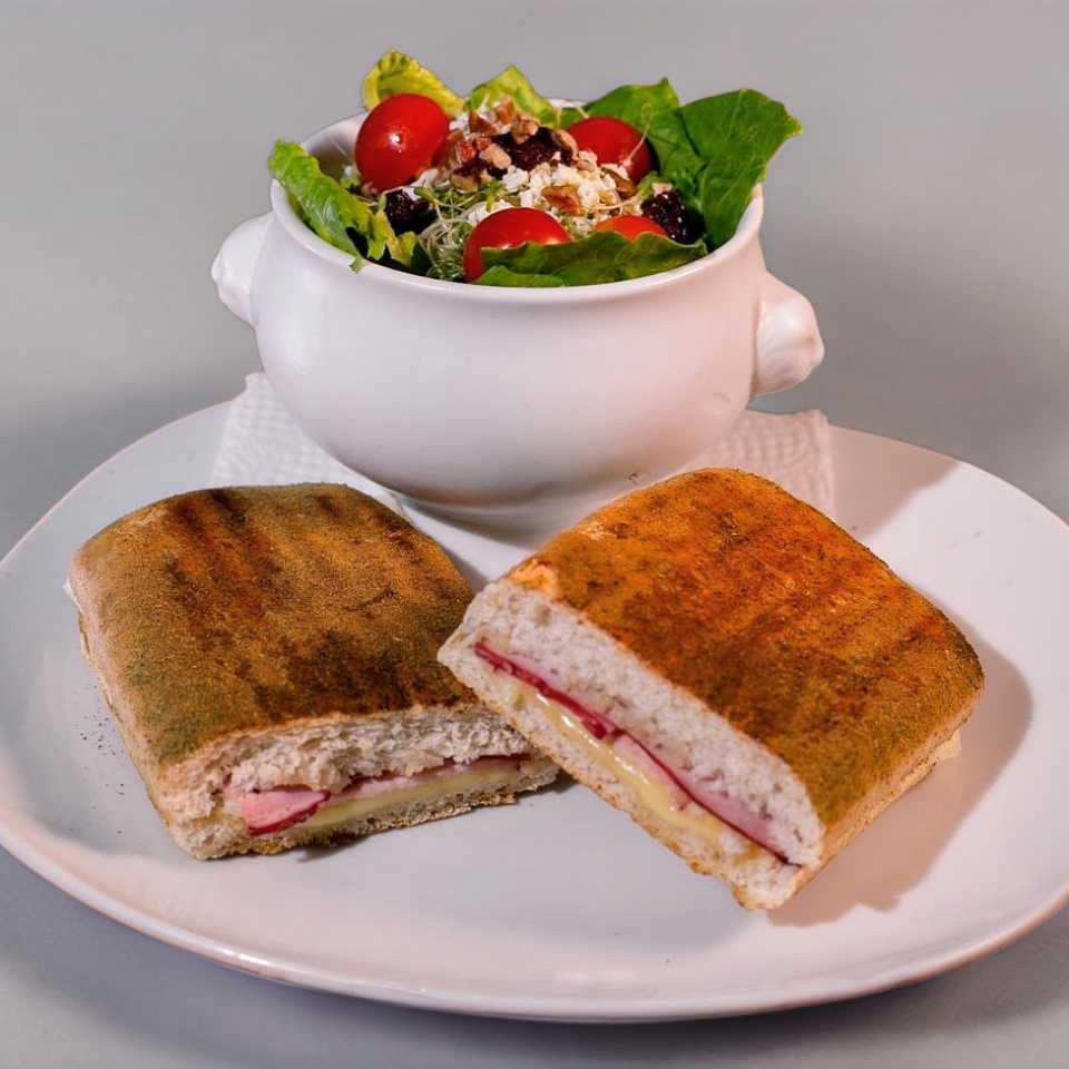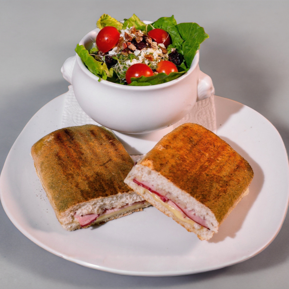 Panini con tomate deshidratado, quesos y arandanos, acompañado de ensalada