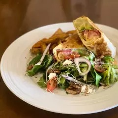 Tortilla de harina rellena de huevo, aguacate, queso, acompañadao de papas de la casa y ensalada.