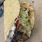 Suculento taco con tortilla recién hecha, costra de queso doradito, jugosa carne asada y suave guacamole.