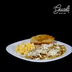 Deliciosos chilaquiles rojos y verdes, acompañados de guisado y panela fresca.