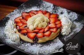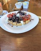 Crujiente pan francés coronado con selección de frutos rojos de temporada.