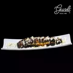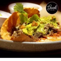 Tortilla jumbo con frijol, queso, aguacate y arrachera con aderezo de chipotle.