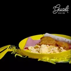 Huevito revuelto o estrellado, acompañado de salchicha y jamón con papa de la casa.