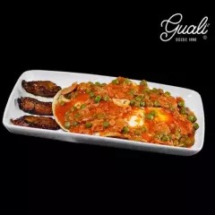 Huevos montados en tortilla frita bañados con salsa de tomate, jamón, chícharos y rodajas de plátano frito.