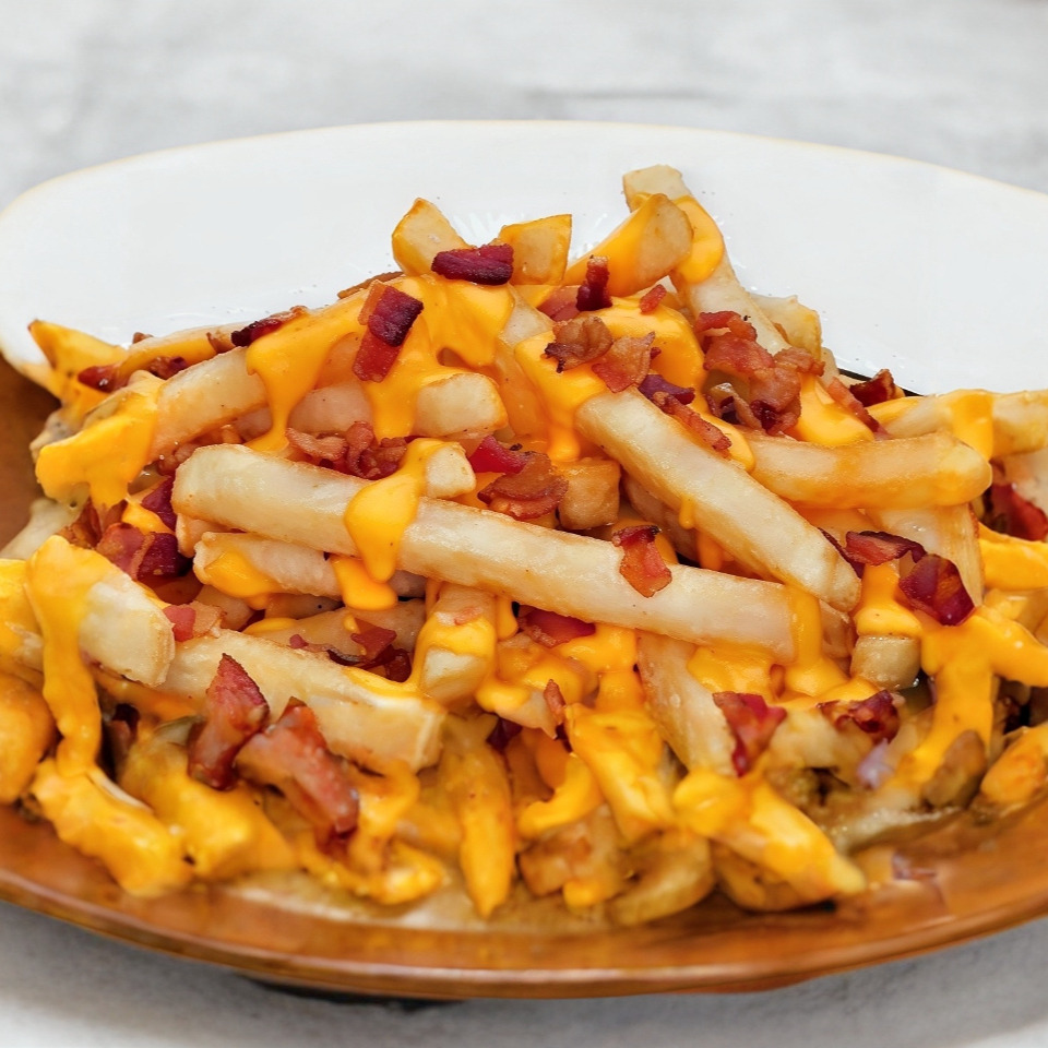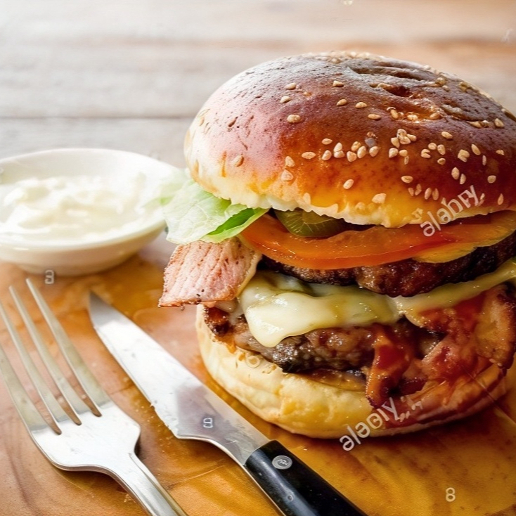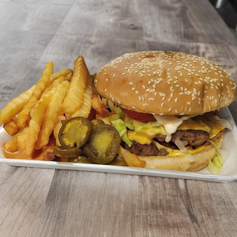 Rica hamburguesa con 3 carnes 3 quesos + doble tocino +papas fritas