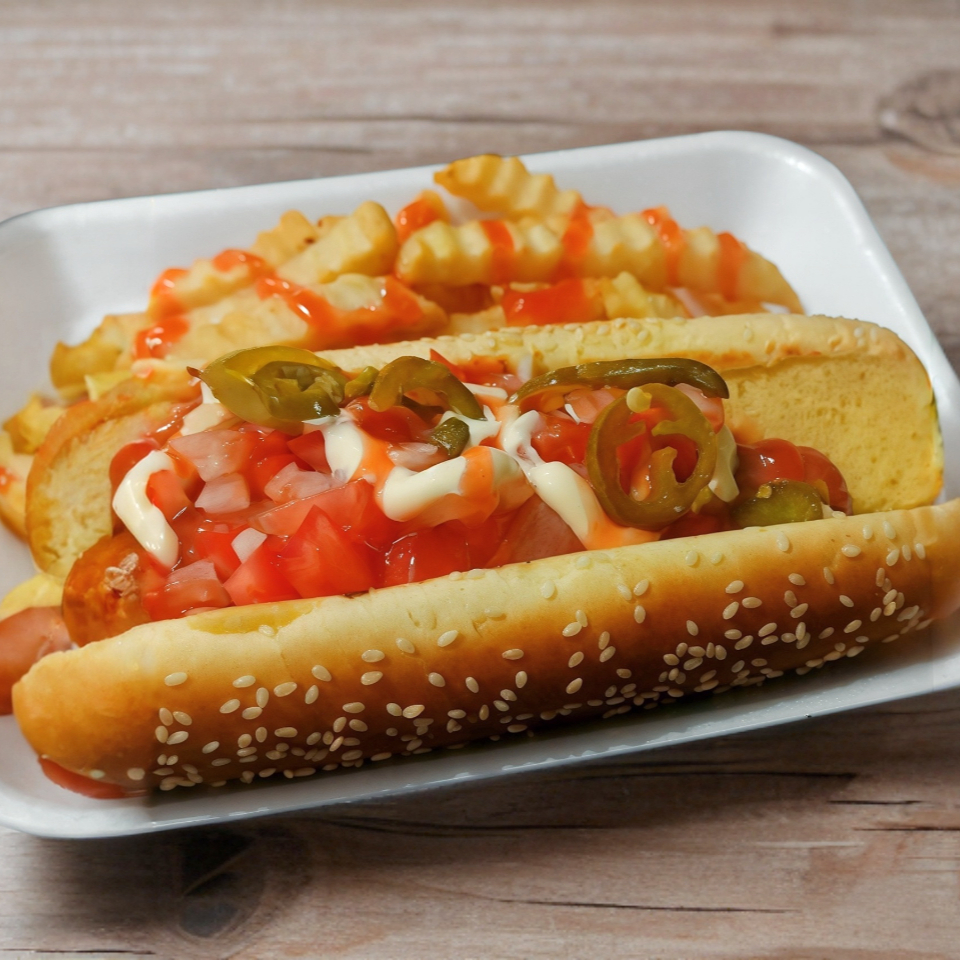 Pan extragrande salchicha extragrande + tocino y papas muy Ricos