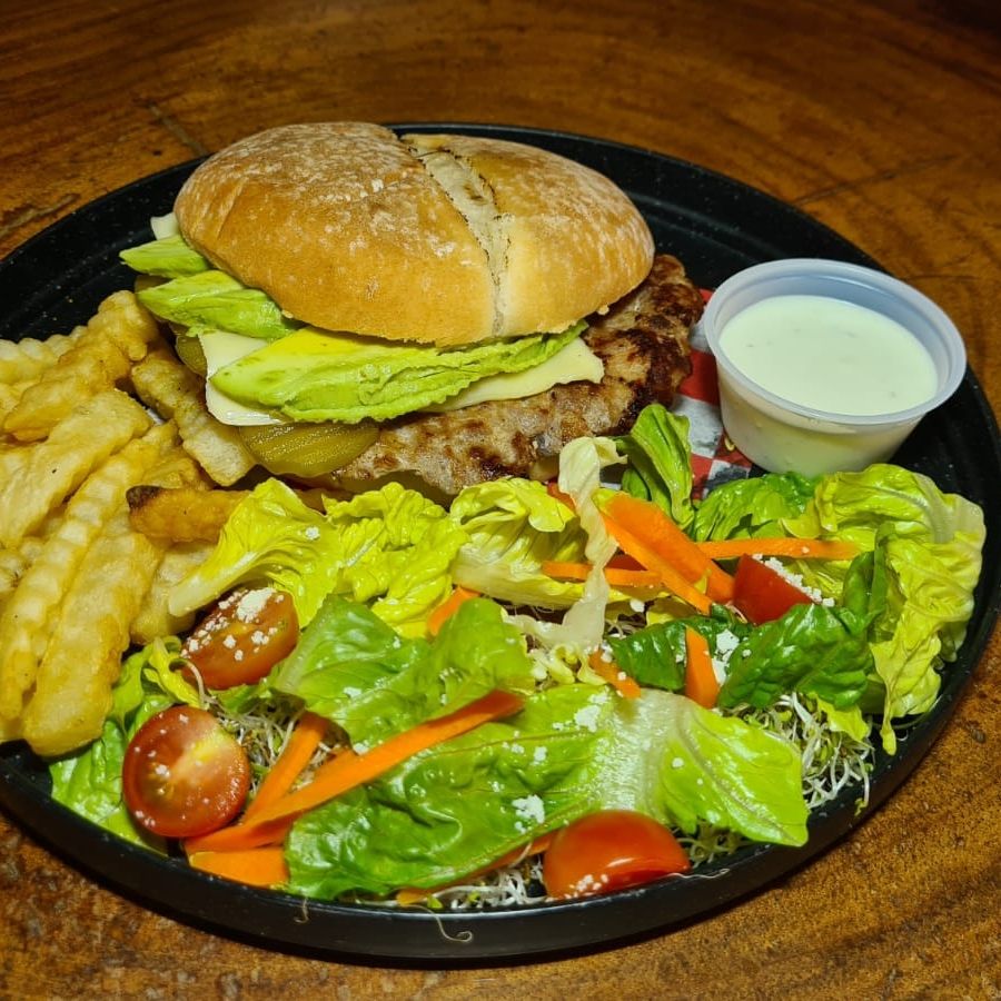 150 grs. de carne 100% de res, queso manchego y amarillo, aguacate sobre un pan brioche. Incluye 200 grs. de papas a la francesa, chiles jalapeños, pepinillos y vegetales mix.