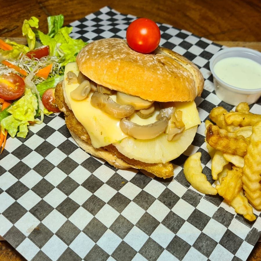150 grs. de pechuga de pollo empanizada, piña, champiñones, queso manchego y amarillo, aguacate sobre un pan brioche. Incluye 200 grs. de papas a la francesa, chiles jalapeños, pepinillos y vegetales mix.