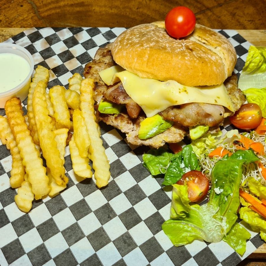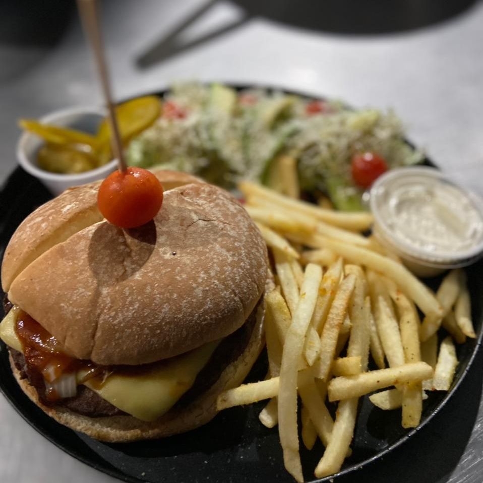 150 grs. de carne 100% sirloin, aros de cebolla, queso manchego y amarillo, bañada en salsa bbq, aguacate sobre un pan brioche. Incluye 200 grs. de papa a la francesa, chiles jalapeños, pepinillos y vegetales mix.