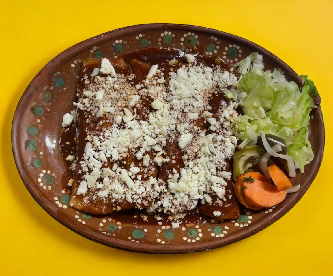 Riquísimas tortillas guisadas con mole dulce de picadillo con queso lechuga y queso