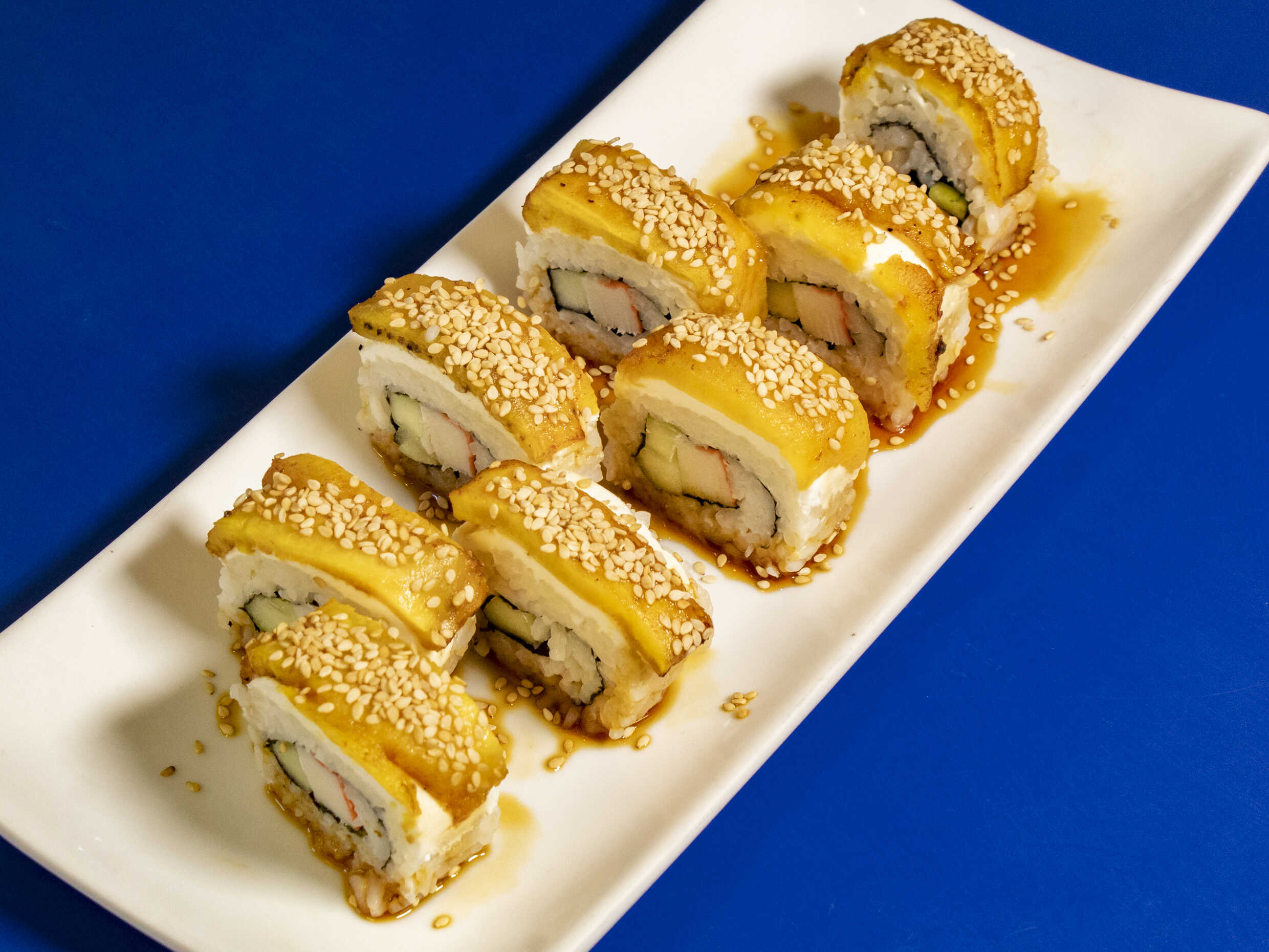 Por dentro salmón, Philadelphia y plátano macho, por fuera cubierto de ajonjolí y salsa de ánguila.
