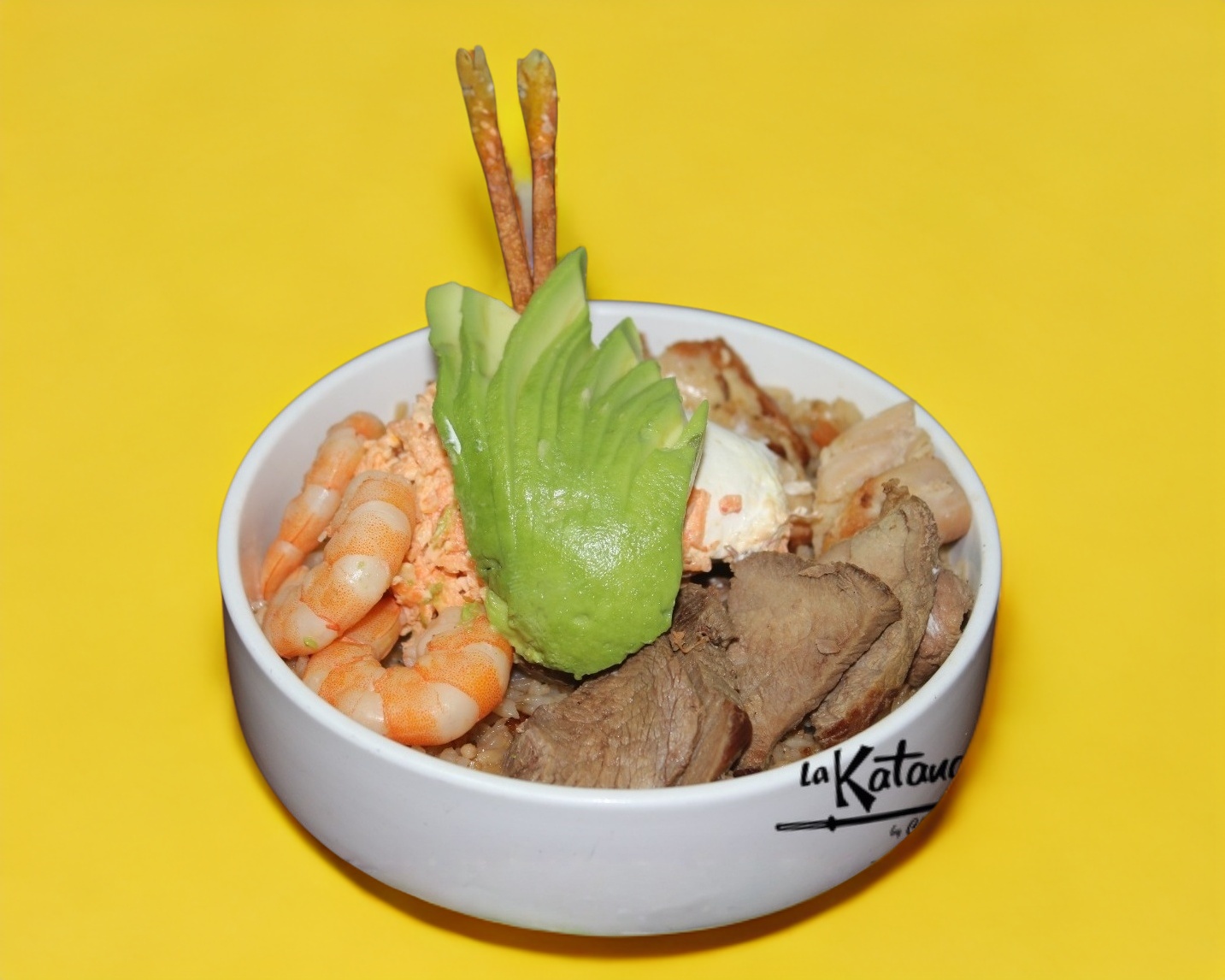 Arroz salteado con vegetales y salsa de soya, con res. Coronado con queso crema, aguacate y tampico.