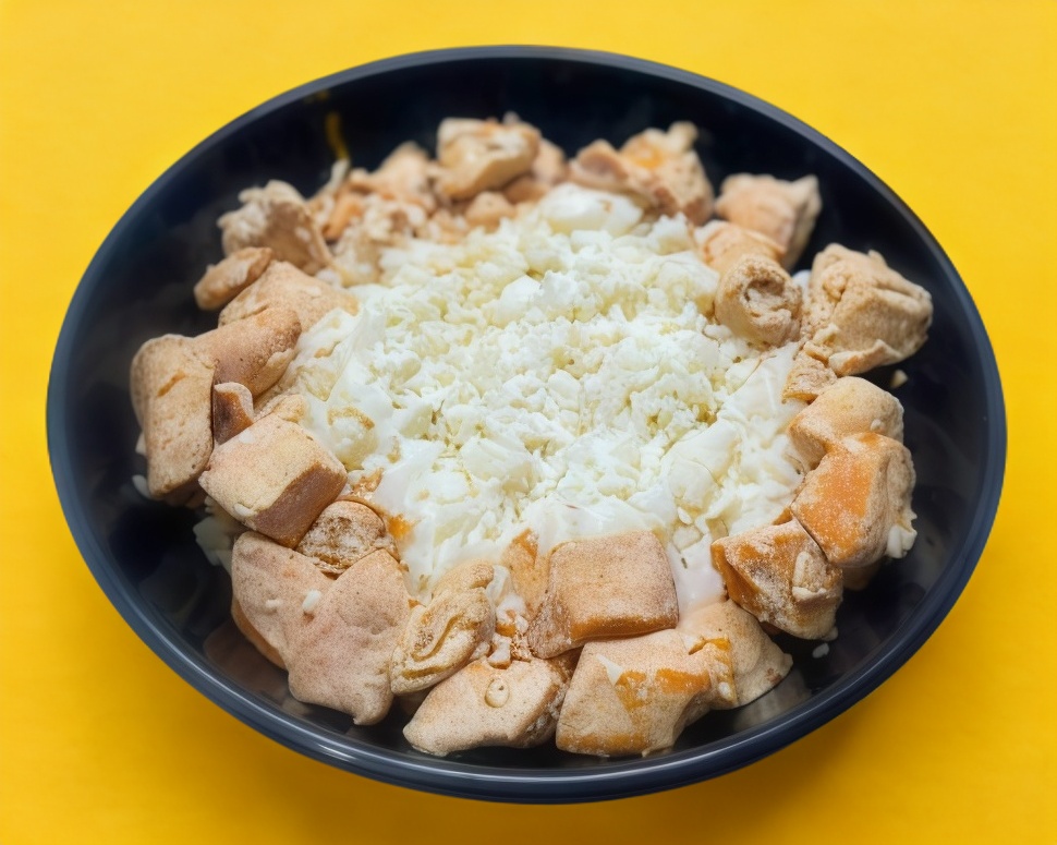 Esfera de arroz empanizada con queso, crema y pollo.