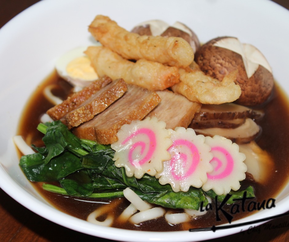 Ramen de la casa con fideos udon, rebanadas de cerdo, camarón tempura, huevo cocido y hongos. Servido en caldo oscuro perfumado con jengibre.