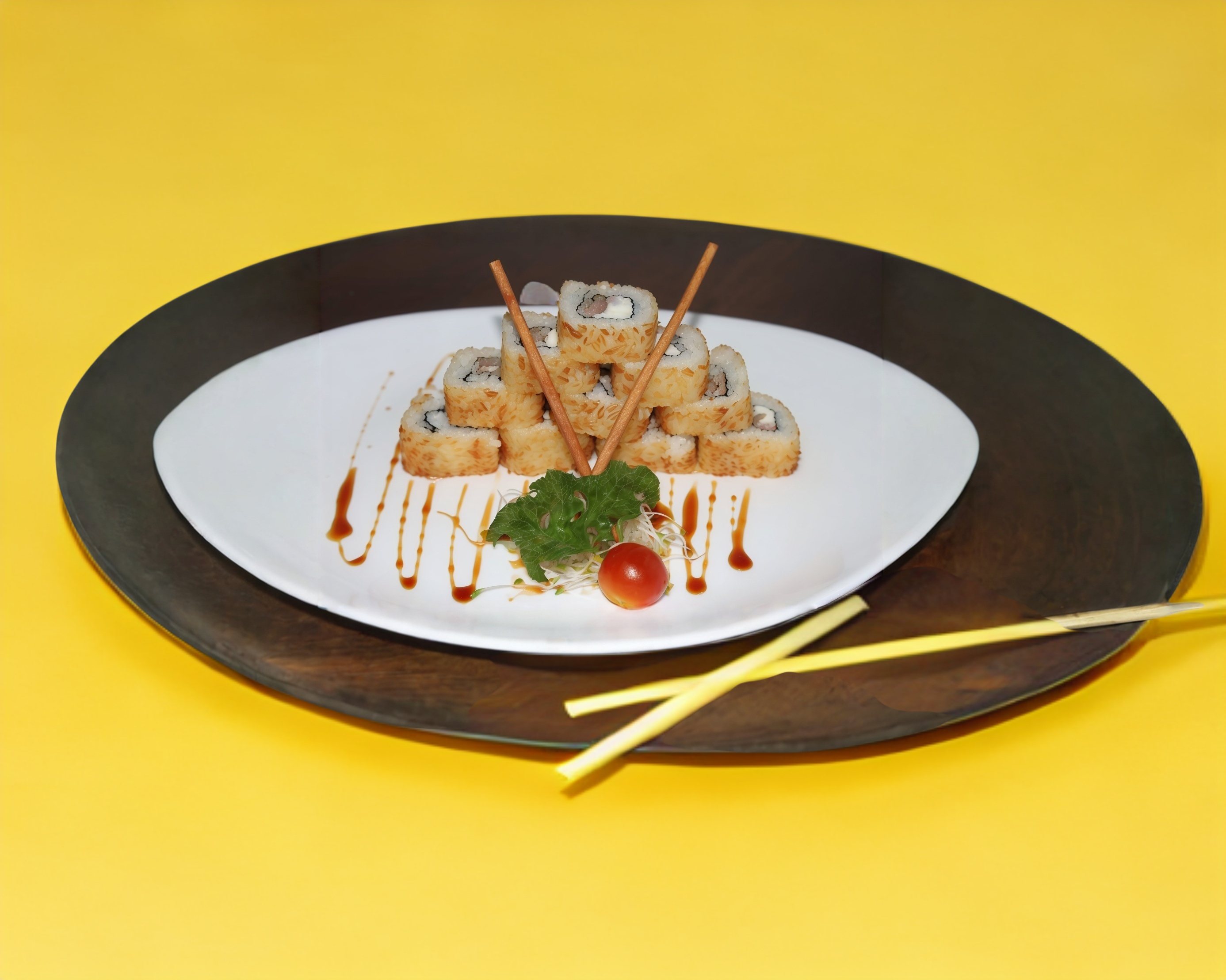 Por dentro pepino, aguacate, queso crema y surimi; por fuera empanizado con topping de tampico y salsa de anguila.