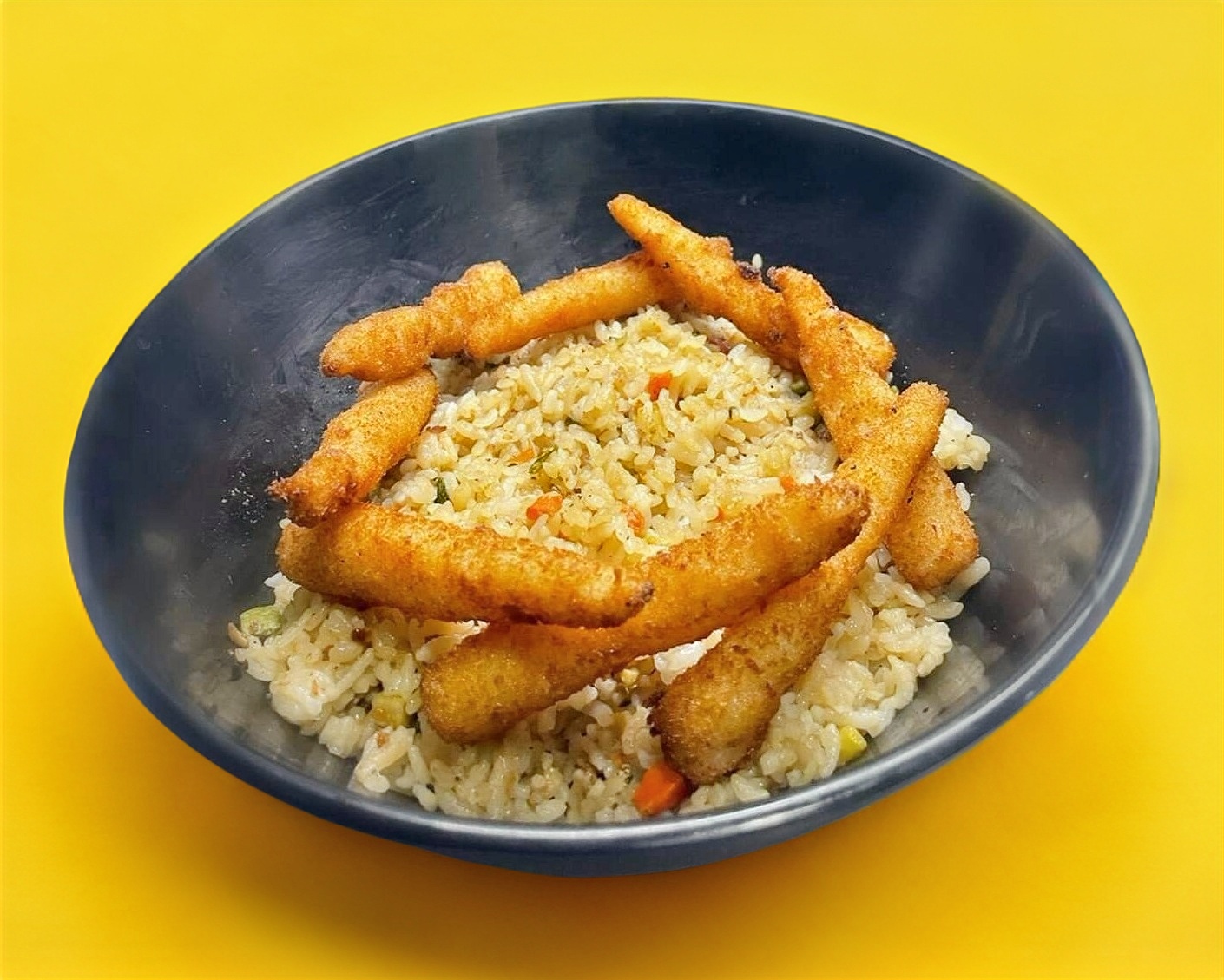 Arroz salteado con vegetales y salsa de soya, con camarones empanizados.