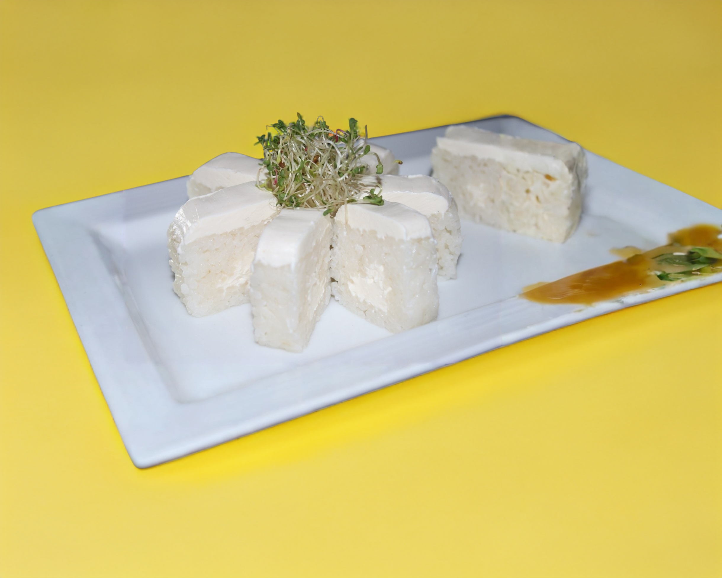 Esfera de arroz empanizada con crema, queso, aguacate y tampico.