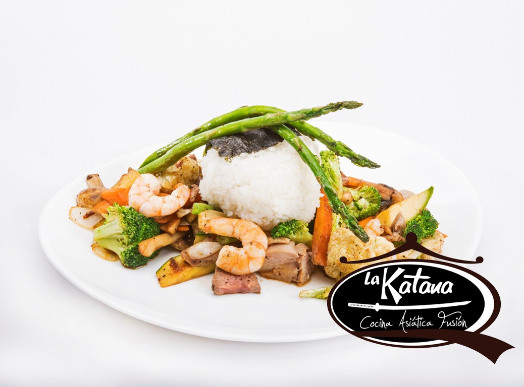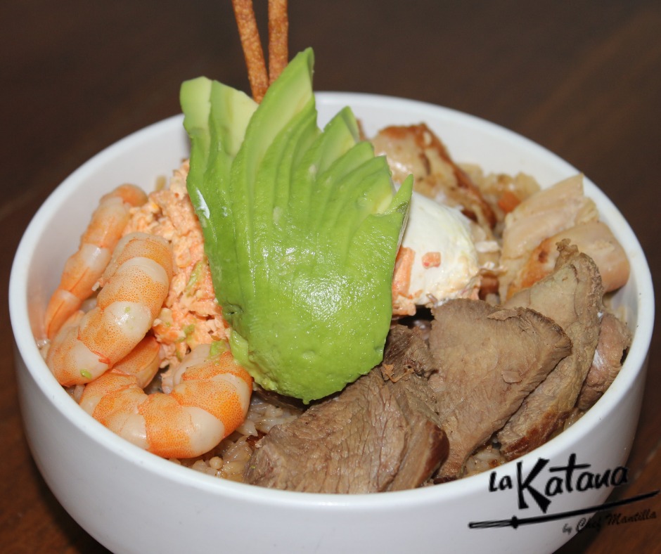 Arroz salteado con vegetales y salsa de soya. Con res, pollo y camarón, coronado con queso crema, aguacate y tampico.