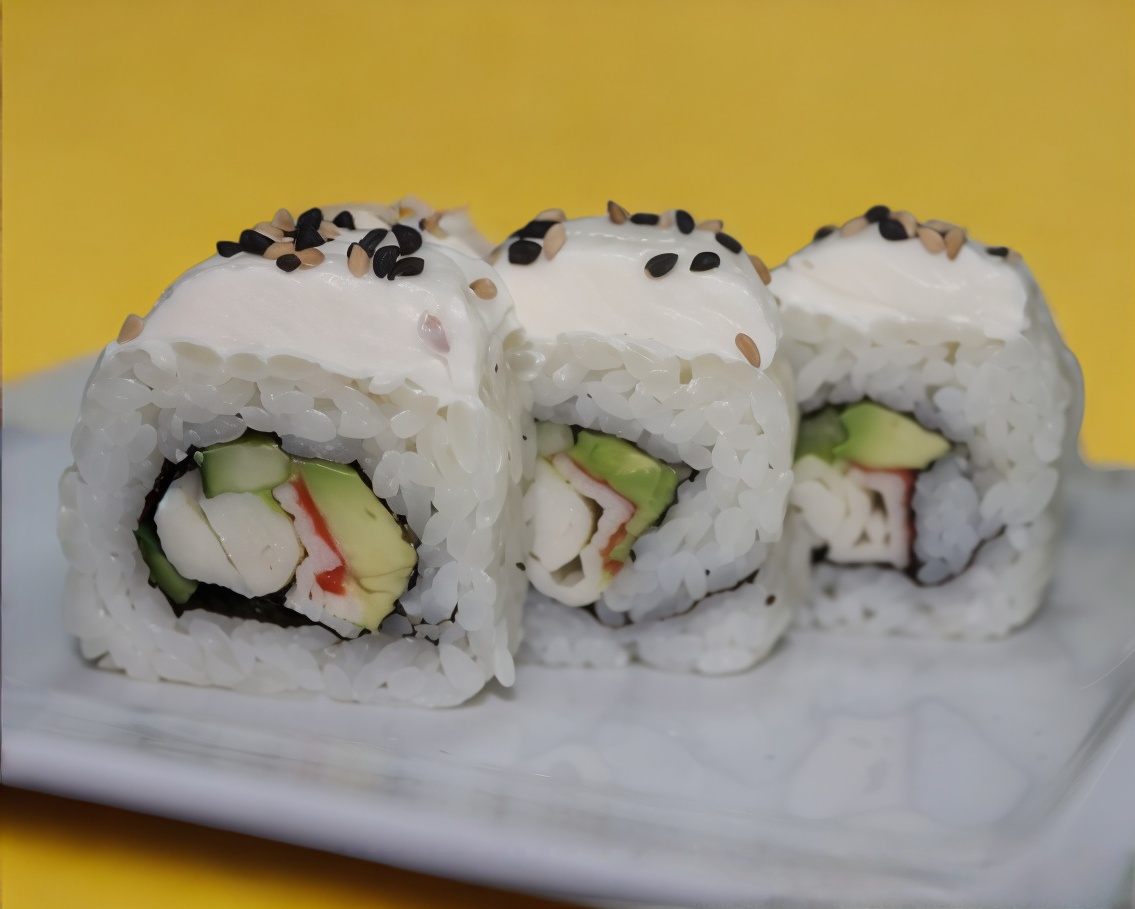 Por dentro pepino, aguacate, queso crema y surimi; por fuera queso crema y ajonjolí tostado.