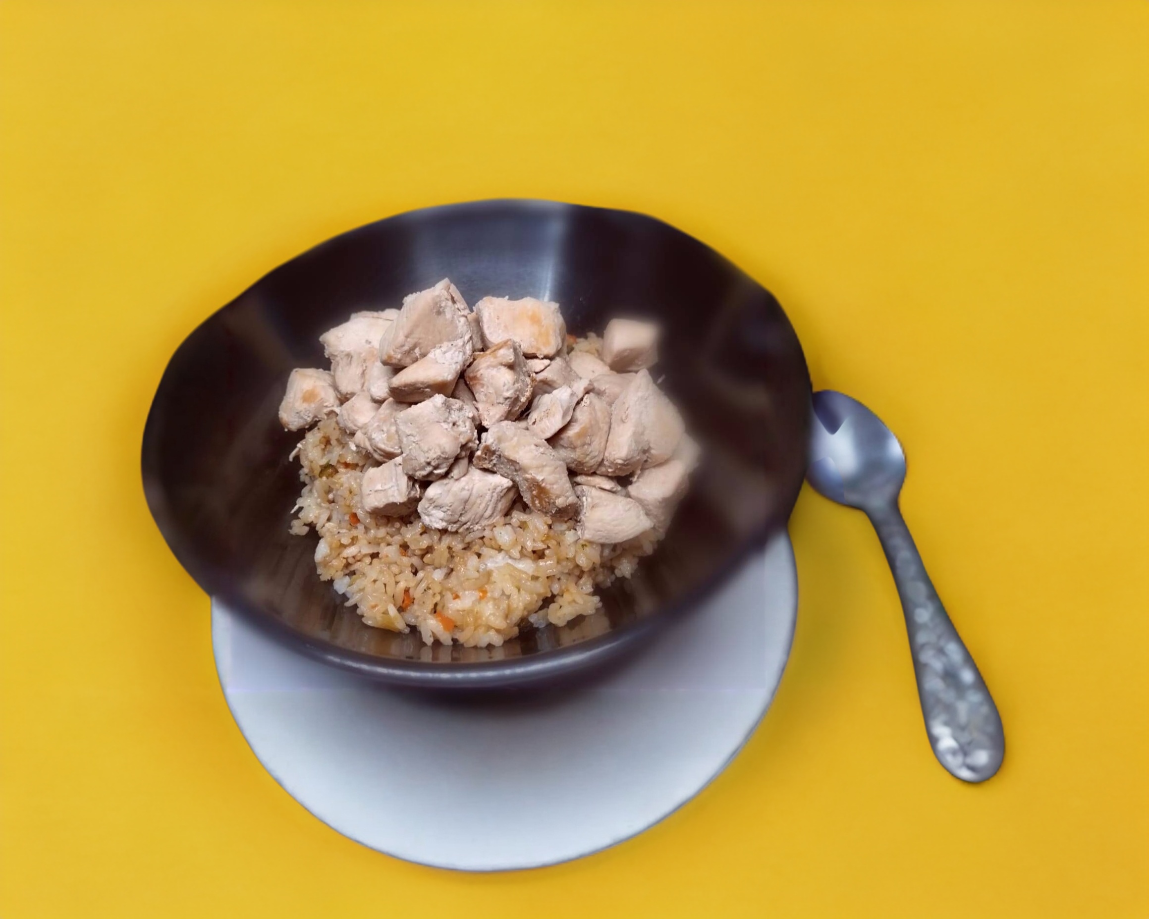 Arroz salteado con vegetales y salsa de soya, con pollo.