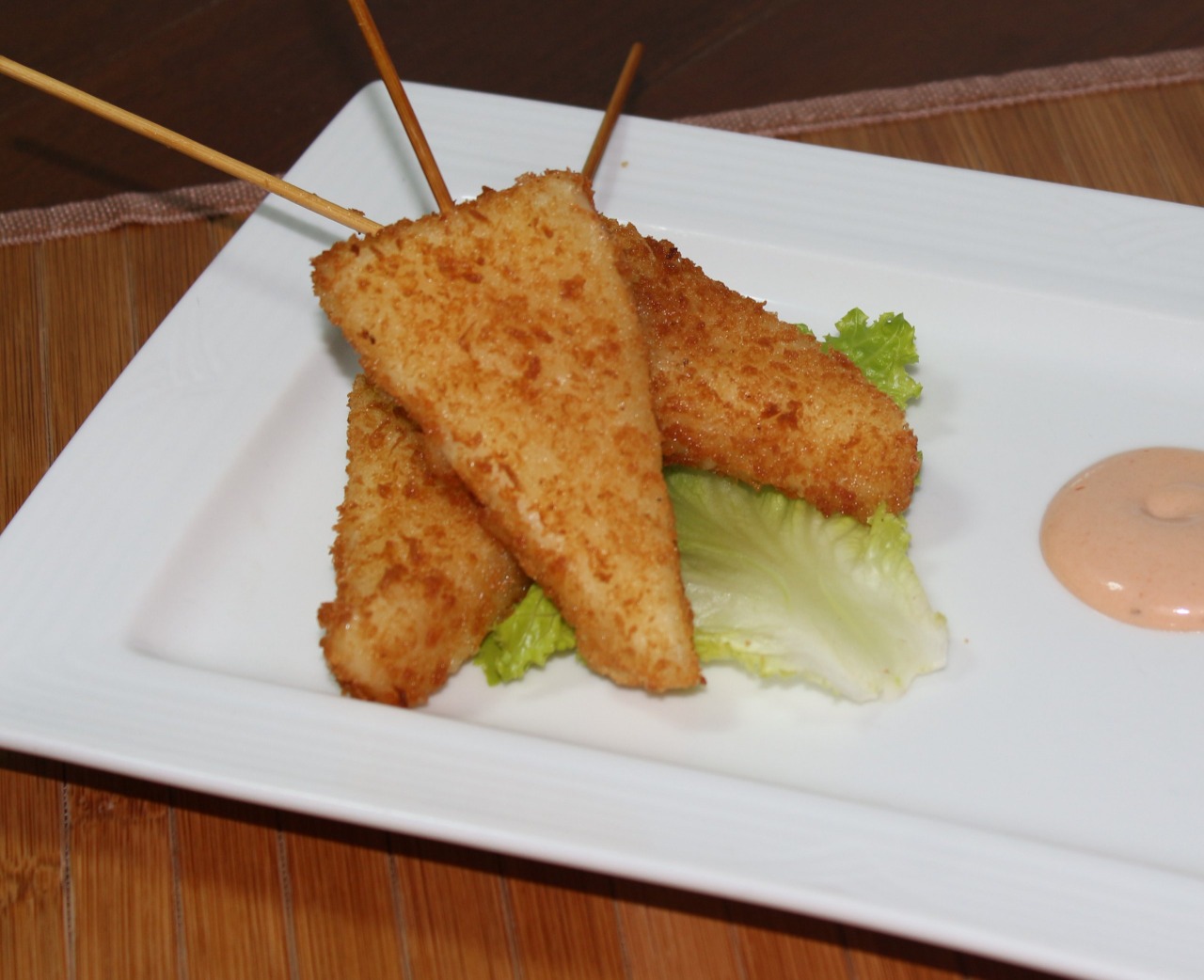 Por dentro res, aguacate y queso manchego; por fuera empanizado con cebollitas a la plancha.