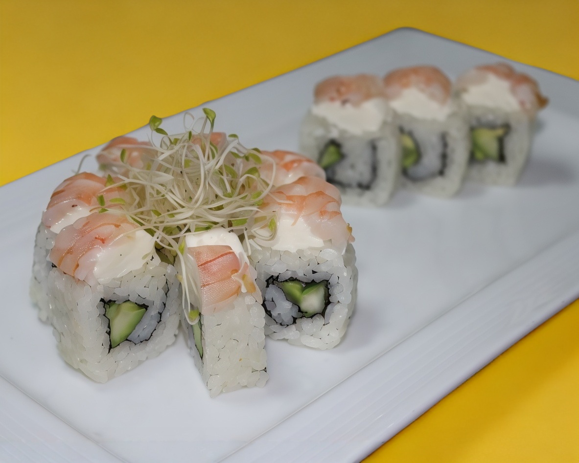 Camarón y queso crema por fuera; con pepino y aguacate por dentro.