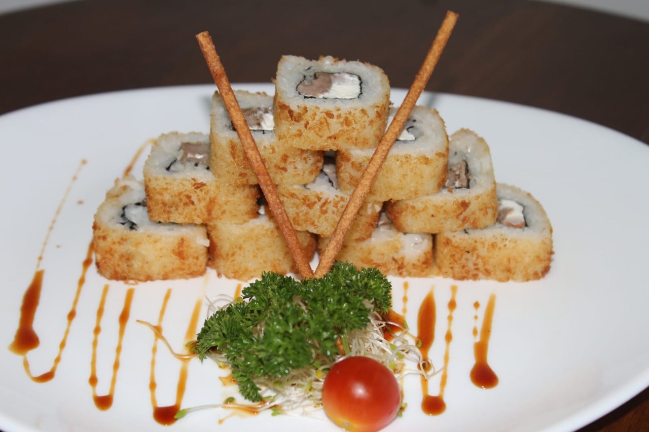 Por dentro pepino, queso crema y zanahoria; por fuera plátano frito y salsa de anguila.