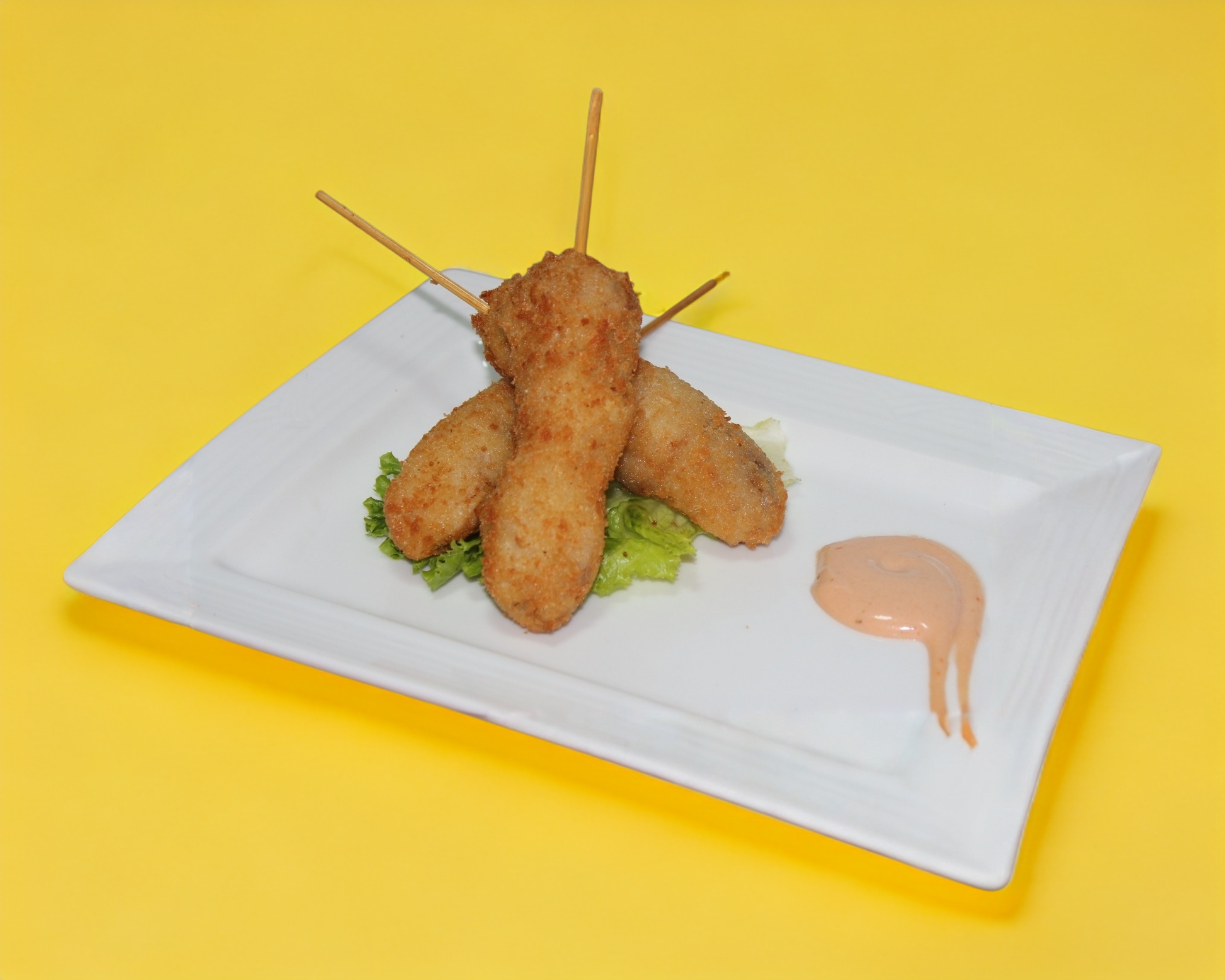 Esfera de arroz empanizada con crema, queso, aguacate y pollo, res y camarón.