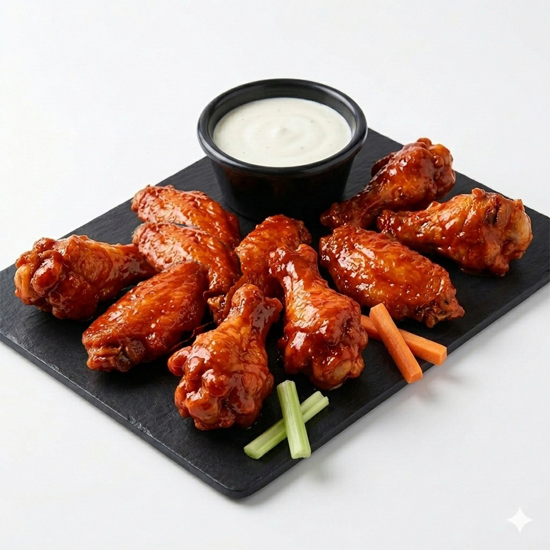 Deliciosas alitas de pollo bañadas en la salsa de tu elección. acompañadas de aderezo ranch. (500 gr)