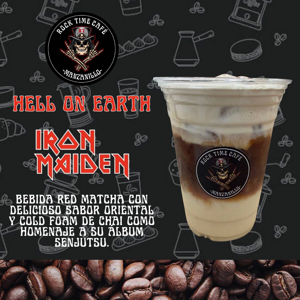 Red Matcha (Rooibos Tea) con delicioso sabor oriental y cold foam de chai como homenaje al álbum SENJUTSU de IRON MAIDEN.