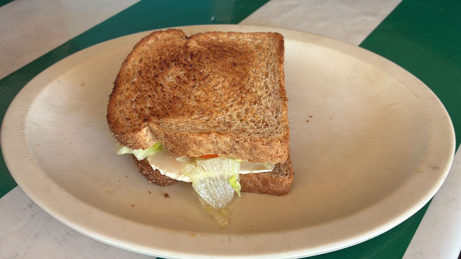 Queso panela fresco (90 g), con jitomate, aguacate y lechuga en pan ligeramente tostado.